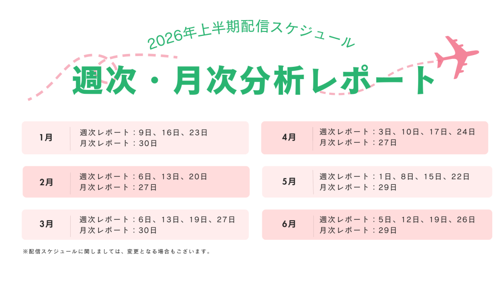 週次レポートは、基本的に毎週金曜日に更新、月次レポートは月末に配信を予定しています。レポートのダウンロードは上記から実施できます。