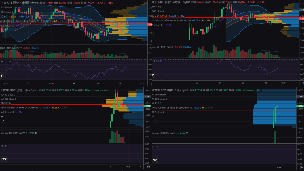 現在のASTERは1.90ドル(約285円)前後で推移しており、直近では1.85ドル(約278円)が下支え、2.00ドル(約302円)が上値の壁となっています。もし2.00ドル(約302円)を超えて安定すれば、次は2.20ドル(約333円)や2.50ドル(約379円)まで上昇する可能性があります。一方で1.85ドル(約278円)を割れると、1.75ドル(約265円)や1.60ドル(約242円)まで下がる恐れもあります。短期的には買いの勢いがやや強めですが、2.00ドル(約302円)を超えられるかが今後の分岐点です。(2025年9月29日執筆現在)