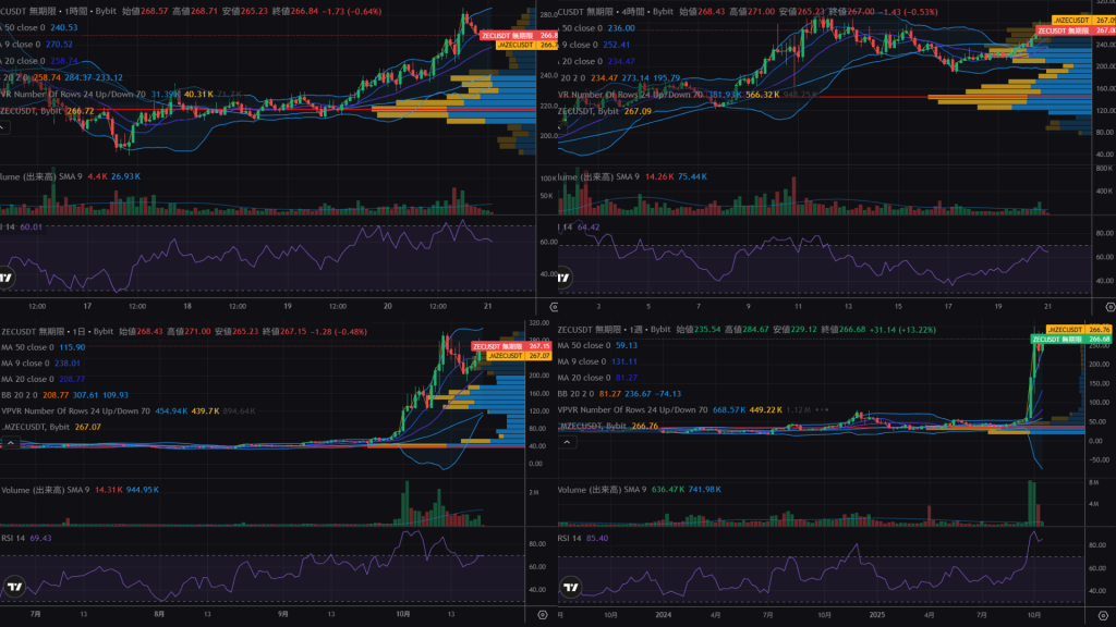 ZECはここ数週間で大きく値上がりし、現在は約266ドル(約4万円)付近で推移しています。短期ではやや勢いが落ち着き、250ドル(約3.8万円)あたりに下支えがありそうです。一方で、280ドル(約4.3万円)を超えると再び上がりやすく、310ドル(約4.8万円)を目指す動きも考えられます。長期では150ドル(約2.4万円)を保てば上向きが続く可能性が高く、今は一時的な調整の中でも買い意欲が強い局面と見られます。(2025年10月21日執筆現在)