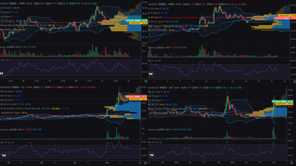 現在のDASHは、1枚あたり約45.00ドル(約6,800円)前後で落ち着いています。短期的には47.00ドル(約7,100円)付近で上がりにくく、下は45.00ドル(約6,800円)が支えになっています。もう少し下がる場合は40.00ドル(約6,000円)前後が次の下げ止まりの目安です。長い目で見ると30.00ドル(約4,500円)からの回復が続いており、45.00ドル(約6,800円)を保てれば50.00ドル(約7,500円)まで再び上がる可能性があります。全体的には落ち着いた調整局面です。(2025年10月22日執筆現在)
