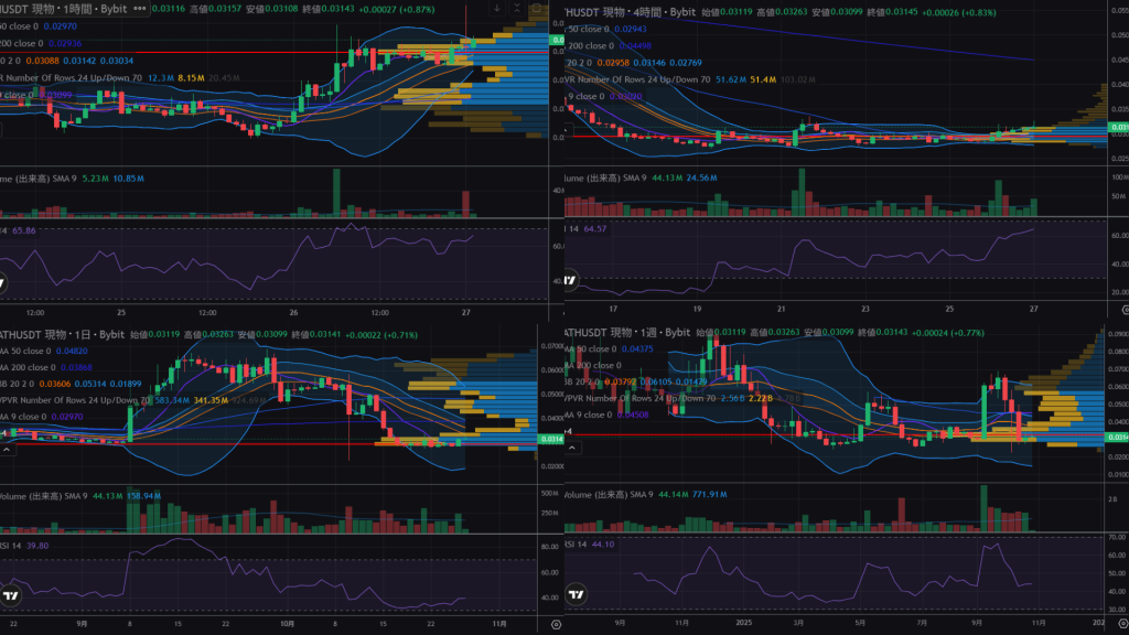 ATHは現在、約0.031ドル(約4.7円)で動いており、少しずつ持ち直す流れです。下値は0.029ドル(約4.4円)あたりで支えられており、この水準を保てば上昇が続きやすい形です。次の目安は0.033ドル(約5.0円)で、ここを超えると0.036ドル(約5.4円)まで上がる可能性があります。一方で0.028ドル(約4.2円)を下回ると再び弱くなる恐れも。取引が増えてきており、ゆっくりと回復の兆しが見え始めていますが、焦らず段階的な動きを見守る局面です。(2025年10月27日執筆現在)